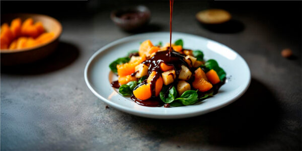 Ensalada de espinacas, fruta y vinagreta de cacao