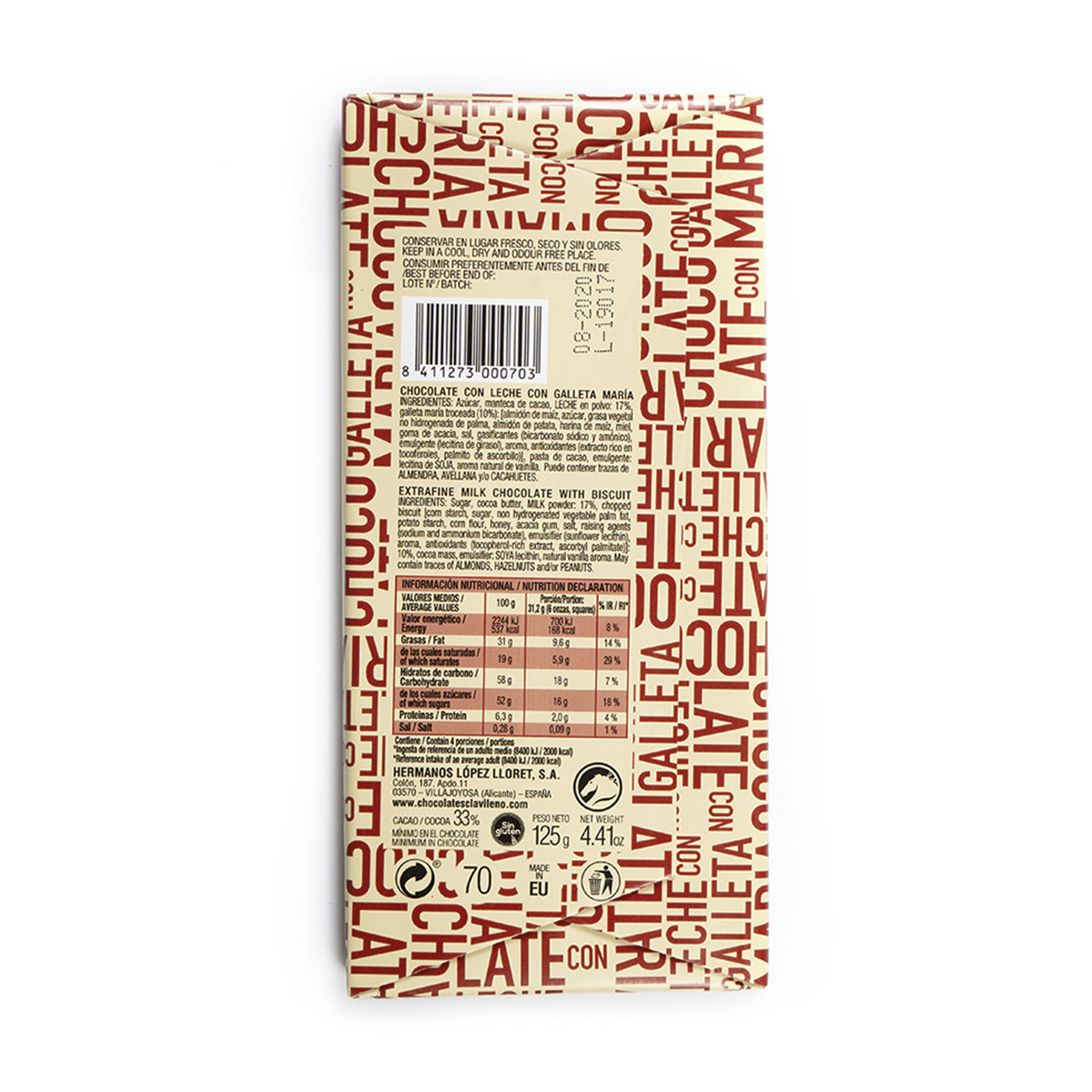 Sugar, cocoa butter, milk powder 17 %, crumbled marie biscuits 10 %: [corn starch, potato starch, rice flour, refined sunflower oil (15 %), sugar, rice starch, acacia gum, fruit juice (apple, pear, grape), salt, gasifier (sodium acid carbonate and ammonium acid carbonate), emulsifier (sunflower lecithin), flavouring], cocoa paste, emulsifier: soy lecithin, natural vanilla flavouring. It may contain traces of almonds, hazelnuts and/or peanuts.