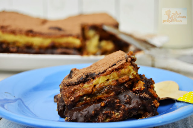 Ponemos otra base de galletas y entonces ponemos la crema de chocolate (reservamos un poco para la cobertura), tapamos con otra base de chocolate y listo, guardamos en la nevera, tapado con film transparente hasta su consumo, Alfonso nos comenta que esta mejor de un día para otro, ya que los sabores han traspasado la galleta y esta muy jugosa y muy rica. cuando lo vayamos a consumir des-moldamos en un plato o bandeja y cubrimos con el chocolate que habiamos reservado y espolvoreamos con el chocolate en polvo.