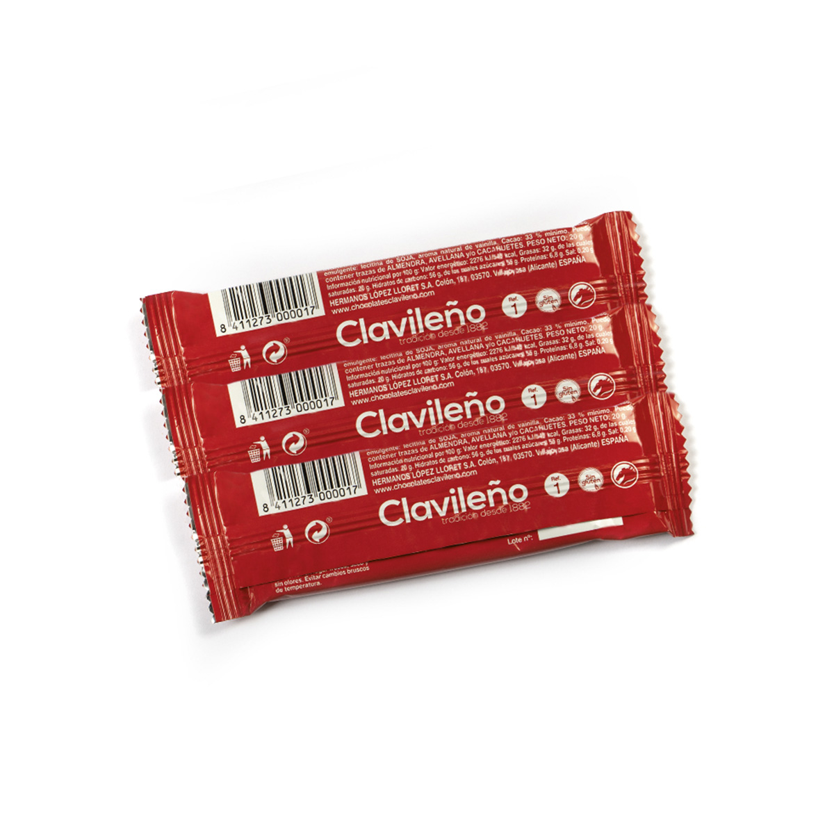 Azúcar, manteca de cacao, LECHE en polvo: 19%, pasta de cacao, emulgente: lecitina de SOJA, aroma natural de vainilla. Cacao: 33% mínimo. Puede contener trazas de ALMENDRA, AVELLANA, y/o CACAHUETES.